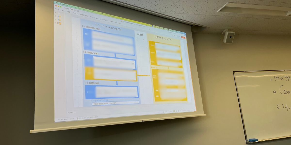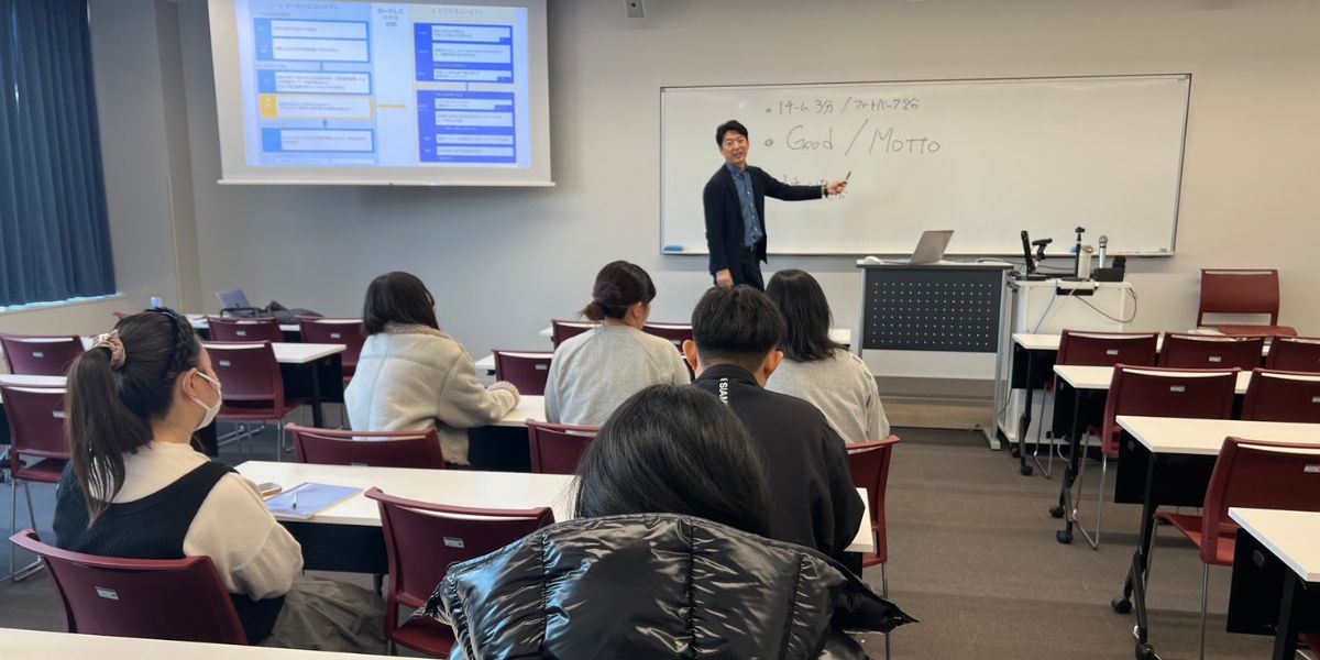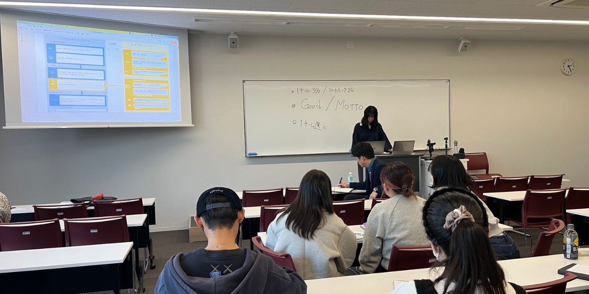 授業では、国際交流シェアハウス事業やホームビジット事業を事例に、社会課題からビジネスモデルへと繋げる過程や戦略を紹介しました。